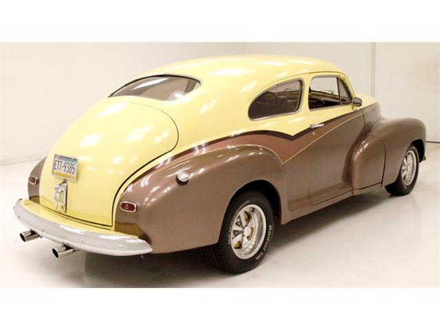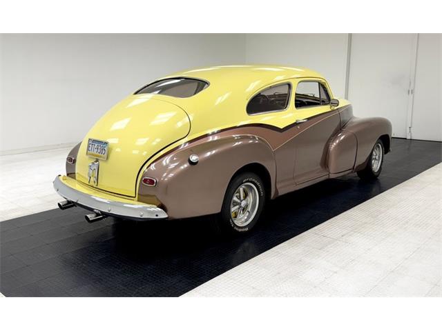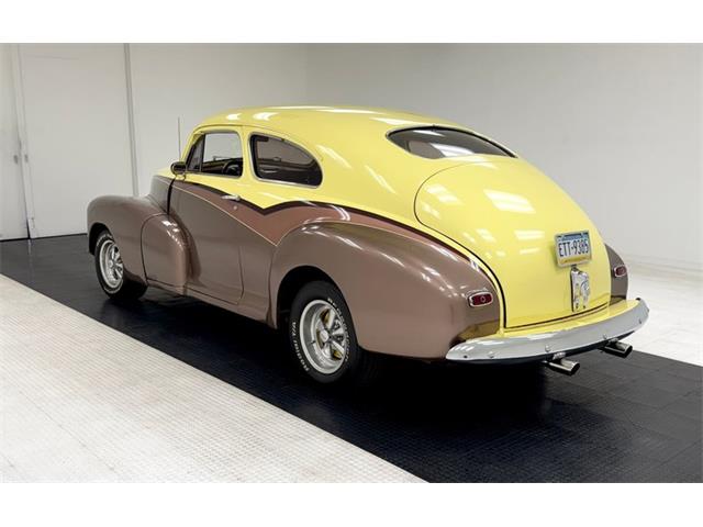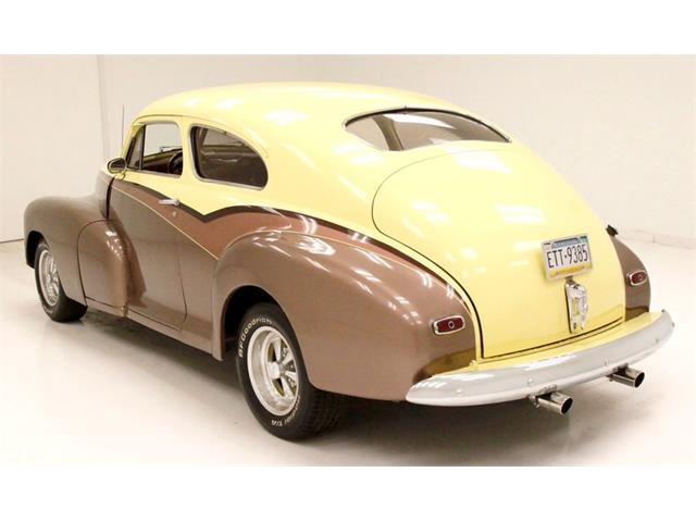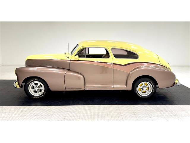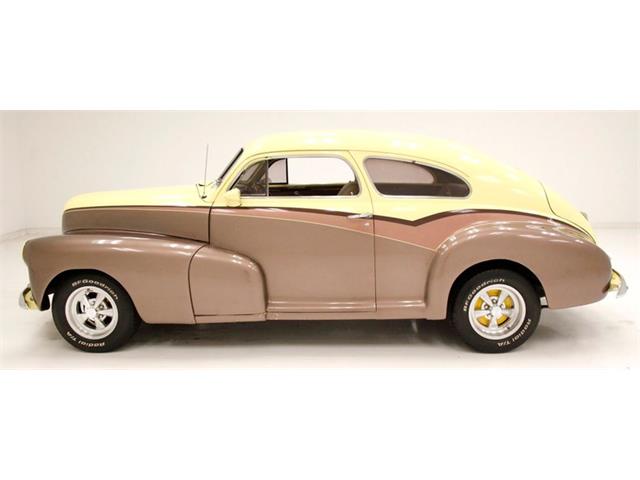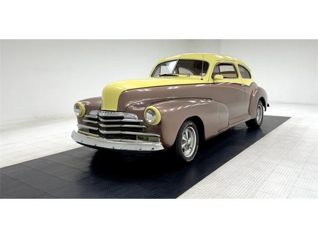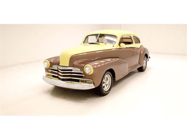 1947 Chevrolet Fleetline Aero Sedan The 1947 Chevrolet Fleetline Aerosedan, despite being the most expensive two-door closed car in the Chevy lineup, was still the most popular model of the best-selling brand in America in 1947. Let's say you're not convinced that appearance is an important factor - maybe the important factor - that drives car shoppers to choose one vehicle over another. Then consider the 1947 Chevrolet Fleetline Aerosedan. Why? After all, mechanically, it was the same as any of Chevrolet's other 10 models offered that year. In standard equipment, it varies little from most cars in the Fleetmaster series, out of which the two-car Fleetline subseries was derived. It had to be the looks. Aerosedans had the benefit of fastback styling that was very much in vogue in the Forties. General Motors gave the style a big boost in 1941 when it launched a well-received armada of B-body Pontiac, Oldsmobile, Buick, and Cadillac sedans and coupes. When a fastback roofline was extended to the A-body program in 1942, Chevrolet jumped on the bandwagon with the Aerosedan. An instant hit, this two-door companion to the notchback Sportmaster four-door sedan topped the Chevy sales charts in war-shortened 1942. When postwar production resumed for 1946, the Aerosedan slipped back into the pack, but then shot back up into sales leadership the next two years. For consignment, a 2-door aero sedan from the bowtie company in 1947 Fleetline street rodded form. This car is in nice condition, has a big 8 cylinder engine under the hood, an original style interior and bleeds 40's style. Showing as an older build, it runs well, and is a nice drivable car for someone who likes the look of the late 40's motoring mixed with street rod looks and that sexy sexy aero back styling. Exterior Bathed in a 4-tone paint job of pale yellow, copper, beige and brown, the finish remains shiny and fairly rust free but we do note areas of blistering, bubbling and evidence of bodywork cracking out with the majority of the issues reserved for the lower sections of the body. Chrome trimmings remain bright and shiny, with some early signs of fading on the chrome grille bars. Moving down the sides reveals an almost "Fairlane" swoop sweep to the paint hues and the original charm of the rounded bulbous looking hood and hanging side fenders with some chrome trimmings have been retained. The running board is about to go away with the turn of the decade it totally will, but this car still has small running boards connecting the fenders which are highlighted by stainless trimmings. This moves us to the ever sloping roofline that simply melts down into the heavily tapered trunk lid after passing the near horizontal rear glass. Bright and shiny chrome Cragar wheels are on all 4 corners and are wrapped in staggered width raised white letter BF Goodrich tires. Interior A swing of the doors and we see the metal painted pale yellow and woodgrain door sills which border embossed tan broadcloth covered panels. These are dressed to the nines with chrome cranks and actuators as well as tan vinyl armrests. The seats tubs are the original and have the original styletan striped broadcloth covering them in a clean coloring, and appear as nearly new with only minor staining. The front bench sits in a tub of smooth vinyl surround and a rear bench sports the same pattern and appears with similarstaining as the front. bench and does offer plenty of legroom. Low pile yellow carpet floods the floors, and it appears as new thanks to the deep pile brown carpeted mats and a tight tan headliner has been installed. Upfront, a yellow and brown metal dash is appearing original and looking nice and aged with no real damage. Original gauges and horizontal ribbed trimmings have some smaller knobs peppering the front panel. A Grant GT wood rimmed 3 spoke steering wheel in front of the dash with a tachometer strapped to the column. A modern AM/FM/CD stereo is occupying the lower dash central and a trio of white faceAutoGage gauges hangs below. Drivetrain Shoehorned into the patina riddled engine bay is a 350ci V8 topped with an aluminum intake manifold and Holley 4-barrel carburetor. Some chrome is on for the valve covers, air cleaner lid, and alternator giving some nice contrasting bling to the patina. Bolted to the back is a Saginaw 4-speed manual transmission with a hydraulic clutch that sends power rearward to a Ford 9" rear axle. Aside from theobvious powerplant change, the wiring appears to be updated as well. Undercarriage Patina and surface rust cover nearly every inch of the undercarriage with the flooring and frame remaining solid. Invasive rust has taken a hold on the inner rockers and a few of the body hangers, but all else remains solid. Independent coil springs in front and leaf springs in the rear provide the ride and power disc brakes on the front work with power drums on the rear to bring thissleek rod to a halt. Headers snake their way down from the mill and connect to dual exhaust with Flowmaster mufflers for the big exhale. Drive-Ability She started right up and ran smoothly. For a large car, it accelerated nicely, handled well for its size and thanks to the updated brakes stopped very well. We noted that the speedometer and odometer did not click off the miles and there were an abundance of squeaks and rattles coming from the car during our drive. Despite some exterior faults, this car presents nicely as an older build using a very popular and hardly seen thesedays aerosedan. TLC will bring that exterior right back up to snuff, and you will be able to pile your family in and go for a Sunday drive...Remember those?? 14EKL64261 14-Baltimore, MD Assy Plant E-1947 K-Fleetline/Fleetmaster L-December 64261-Sequential Unit Number TRIM TAG STYLE 47 1007-1947 Fleetline 2 Door Aero Sedan BODY M19918-Baltimore Body # TRIM 132-Tan Striped Fabric PAINT 347-Wing Blue Classic Auto Mall is a 336,000-square foot classic and special interest automobile showroom, 
