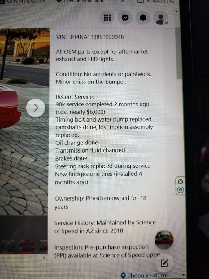 1995 NSX T CAR IS IN PERFECT CONDITION, RUNS DRIVES AND LOOKS LIKE NEW, VERY ORIGINAL EVERYTHING IS ORIGINAL EVEN THE PAINT, SCIENCE OF SPEED SAID IT'S A TOP 10 CAR, 5 SPEED, JUST HAD $6,000 WORTH OF SERVICE DONE, SEE PICTURES FOR DETAILS, PHONE CALLS ONLY, THANKS ROD
