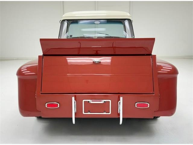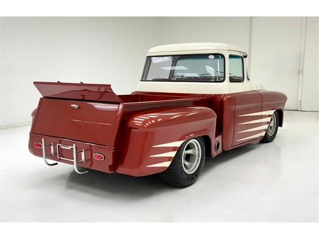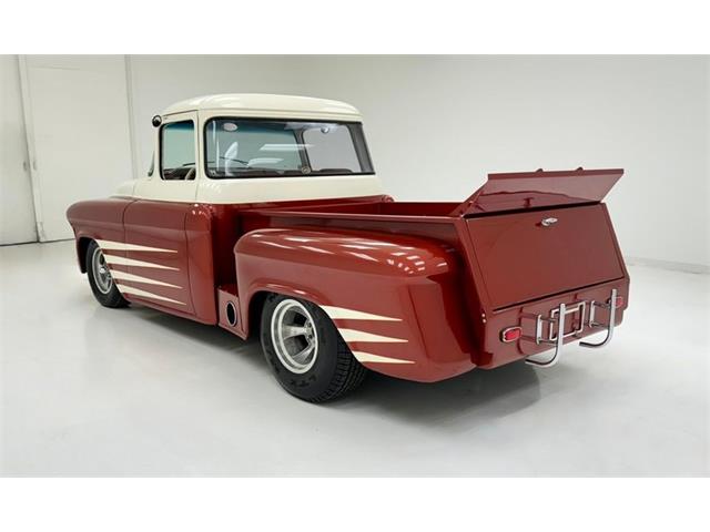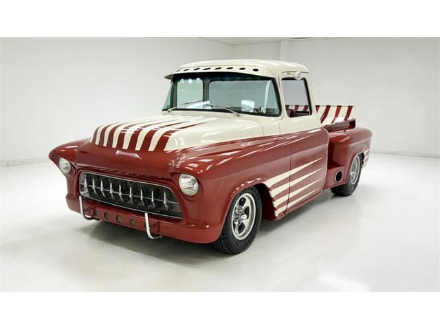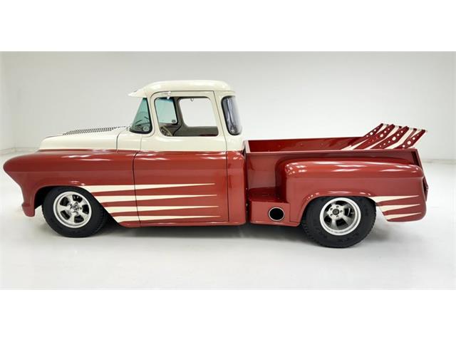1955 Chevrolet 3100 1/2 ton Apache Pickup The Chevrolet Task Force was Chevrolet's successor to the Advance Design series. The Task Force Series ran from late 1955, (second series), through 1959. At GMC dealers, it was called the Blue Chip Series. Designed by Ned Jordan, Chevrolet's Task Force pickups blurred the line between passenger cars and trucks. They were more comfortable and roomier than previous Chevy trucks, and they offered stylish features like a wraparound windshield, hooded headlights, and an egg-crate grille. For consignment, a nicely buttoned up 3100 Apache pickup hot rod truck from Chevrolet and right out of 1955. A few upgrades in the powertrain, some snappy long arrow point painting using copper metallic and cream, some extra bodywork for the sidestep exhaust outlets, and rear tailgate setup now with a rear spoiler and rear tubbed wheel wells. Our consignor states it was owned by an older lady? I'd like to go up against her! Exterior Laser straight steel panels are all around and gaps are drum tight for that steel. All slabs are bathed in copper metallic on the lowers with some cream thin pointy arrows on the front quarters and door panels. The uppers are in the cream for the hood and roofline and the rear spoiler. Borrowing from the doors contrasting long pointy arrows are in the copper and are definitely the deep part of the pool and shines like the fish that swim in it. Hooded headlights flank either side of the now battleship simplified chrome grille insert and surround. The front bumper has been shaved and now there are 2 vertical round chromed pushers rising from below the front end. A bulbous hood runs back to the curved glass which is under a cream drilled metal visor. New chromed sport mirrors are on the doors that have had their handles shaved. For the back of the truck it's all bed, some boxed side steps which house the massive exhaust outlets and angle back to the rounded tubbed rear fenders. These move to the rear where they frame the bed and a now angled tailgate and custom fabricated roll pan with the taillights and more chromed tube vertical push bars. The cream painted steel smooth bed is taken up mostly by the rear spoiler which starts on the bed and rises gently to above the tailgate. Plenty vents in the hood, and the insert for the grille is a fine punched hole pattern stainless. 15-inch polished wheels are on and in the back we see the 31x10.50R15 big tires in the tubs. Interior More copper and cream for the all steel door panels. Cream uppers and copper lowers that have an orange pinstripe triangulated accenting on the lowers. Inside late model low back wide buckets with copper vinyl edges and seat insert and then halfway up the back it turns to cream vinyl. These sit upon copper plastic pedestals and float on copper carpeting. A drilled short lever shifter is rising for the driver in the center, and there is also a small console with some nifty angled smokestack cup holders and push button cruise control. In front is a metal dash n cream and it has been modified from the original looking much like a '56 Chevy with the instrument fan and now 2 circular instruments in this field. A peppering of round chrome bezel gauges is on the remaining parts of the dash left and center. Here also is an AM/FM/CD radio. Fronting the dash is an octagonalcream padded rally steering wheel. A shout to the dash top which is copper and has wild undulating pin striping on it. Drivetrain A flip of the big bulbous hood, and floating in the center is ...WAIT..no engine? Actually it's a custom fabricated panel that covers the entire engine bay. It's mostly copper with some cream accenting in the center. Under these panels is the heartbeat of America or at least this truck, in the form of a 350ci V8. It sports a single Edelbrock 4-barrel carburetor, and on back is a Muncie M20 4-speed manual bolted on. A Ford 9 inch rear axle is spinning those big tires on the back. The mill has 355.9 dyno proven hp. Undercarriage Underneath is blasted and painted in black steel framing and suspension. A Mustang II style suspension with coilovers is up front, and on back are ladder bars with coilovers. Power disc brakes are now on the front and power drums for the rear. Headers and a Hushmaster mufflers are on. The rockers are solid and all of the add ons are neatly installed with wires and lines run with care throughout the undercarriage. The back tubbing is well done with a spare fuel tank. Drive-Ability This truck roared to a start and accelerated like it was on fire to the test track and on it as well. It handled beautifully and came to a quick stop. The plush seats are a plus, and there are plenty of gauges to distract your attention on the dash. A great and meticulous custom rodded build, new engine, power accessories, a nice exterior paint and graphics and with a comfy interior. A neat looker and a hot cooker, we give you the 1955 Apache 3100 custom, self-proclaimed "My Chevy". Move over, says grandma! H255L005441 H-3100 Series 2-Second Series 55-1955 L-Los Angeles, CA Assy Plant 005441-Sequential Unit Number Classic Auto Mall is a 336,000-square foot classic and special interest automobile showroom, featuring over 850 vehicles for sale with showroom space for up to 1,000 vehicles. Also, a 400 vehicle barn find collection is on display. This vehicle is located in our showroom in Morgantown, Pennsylvania, conveniently located just 1-hour west of Philadelphia on the I-76 Pennsylvania Turnpike. The website is www.classicautomall.com and our phone number is (888) 227-0914. Please contact us anytime for more information or to come see the vehicle in person.