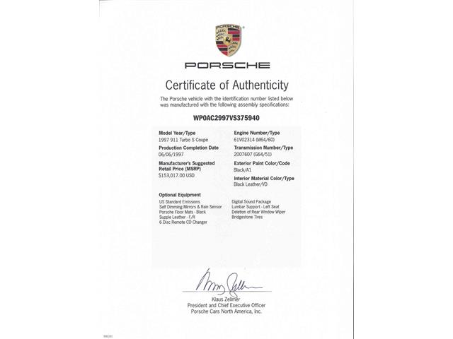993 Turbo S, Black/black, 8,250 miles, 18” Turbo S wheels with correct finish, full supple leather, lumbar driver seat, digital sound package with hi-fi, CD and changer, self-dimming mirror & rain sensor, rare rear wiper delete, fresh service, Certificate of Authenticity, finest available.Vehicle